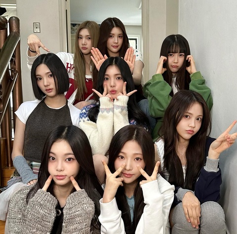 Ang "Hearts2Hearts Pre Debut Group" ay nakuhanan sa isang kaakit-akit at kaswal na sandali, na magkasamang nakaupo sa isang hagdanan sa loob ng bahay. Naroroon ang walong miyembro, bawat isa ay nagpapakita ng kanilang natatanging personalidad sa pamamagitan ng kanilang mga pose at ekspresyon. Mula kaliwa pakanan, si A-na, na may light brown na buhok, ay nagtuturo nang pabiro habang si Juun, na may madilim na buhok, ay kinukuwadro ang kanyang mukha. Si Ye-on, na may full bangs, ay nakanguso nang cute sa isang berdeng hoodie. Si Jiwoo, na may kanyang trademark na maikling bob, ay kalmadong nakaupo, habang si Carmen, na may malalaking ekspresibong mata, ay gumagawa ng peace sign. Si Stella, na makikilala sa kanyang mala-pusa na tingin at maliit na nunal, ay gumagawa din ng peace sign, nakasuot ng dark blue jacket. Sa harapan, si Yuha, na may mala-kunehong features, ay marahang hinahawakan ang kanyang pisngi, at si Ian, na may ekspresibong mata, ay gumagawa ng peace sign, na nagpapamalas ng karismatikong presensya. Lahat sila ay nakasuot ng komportable at relaks na kasuotan, kabilang ang mga niniting na sweater, hoodies, at kaswal na pang-itaas, na sumasalamin sa isang maaliwalas at intimate na kapaligiran. Ang tagpuan, isang simpleng hagdanan na may hawakan na gawa sa kahoy, ay nagmumungkahi ng isang candid, behind-the-scenes na sulyap sa kanilang pre-debut na paglalakbay, na puno ng kabataan at pagkakaibigan.
