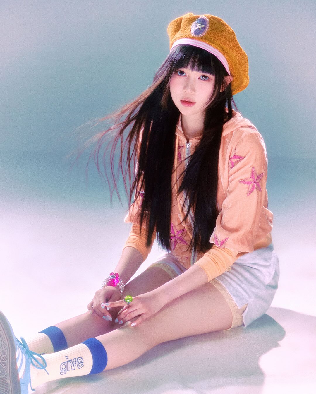 The image is a captivating close-up portrait of A-na from Hearts2Hearts, serving as a teaser for 'The Chase'. She is shown with her face slightly tilted, looking directly into the camera with bright, focused eyes and a calm, intense gaze. Her lips are subtly parted and glossy, showcasing her iconic "duck lips" and delicate features. Dramatic lighting highlights the right side of her face with warm tones, while the blurred background features a vibrant magenta glow on the left, fading into darker hues. Only a small portion of her textured, possibly patterned, outfit is visible, suggesting a stylish ensemble. The overall atmosphere is alluring and sophisticated, perfectly setting the mood for a compelling concept like 'The Chase' during a professional photoshoot.