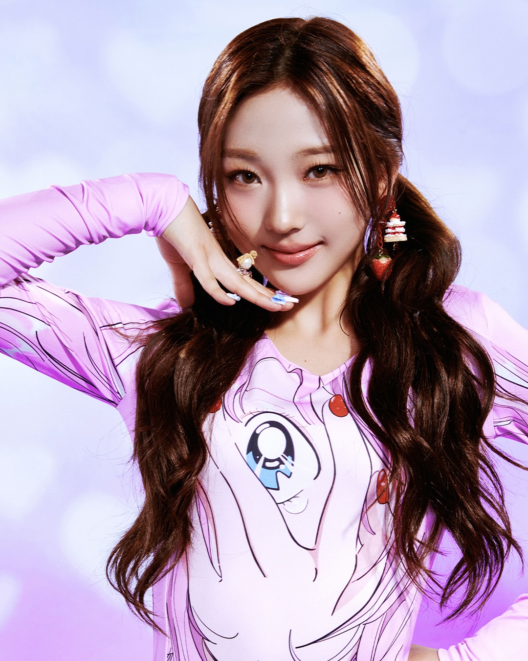 ภาพนี้เผยให้เห็นสมาชิกวง Hearts2Hearts อย่าง Carmen, Stella และ Jiwoo ในสตูดิโอสีพาสเทลสดใส กำลังโพสท่าถ่ายภาพทีเซอร์ STYLE ทางซ้าย Carmen ที่มีดวงตากลมโตและผมสีเข้มยาวเป็นลอนประดับด้วยกิ๊บเล็กๆ กำลังถ่ายเซลฟี่ด้วยกล้องดิจิทัลสไตล์เรโทรพร้อมทำปากจู๋ เธอสวมเสื้อแขนกุดที่มีลวดลายหยดสีบนเสื้อลายทาง กระโปรงบับเบิ้ลสีขาวพองฟู และถุงน่องมีลาย โดยมีกระเป๋าถือสีขาวลายพิมพ์เป็นส่วนเสริมลุค ตรงกลาง Stella ที่มีผมสีเข้มยาวมัดเป็นสองข้างด้วยริบบิ้นสีชมพูกำลังโพสท่าครุ่นคิดโดยมีมืออยู่ใกล้คาง เธอสวมเสื้อแขนยาวสีชมพูอ่อนคู่กับกระโปรงมินิสีขาวมีลายและถือกระเป๋าผ้าใบขนาดเล็กพร้อมพวงกุญแจรูปหมีเท็ดดี้ ทางขวา Jiwoo ที่มีผมบ๊อบสั้นพร้อมหน้าม้าอันเป็นเอกลักษณ์ กำลังขยิบตาอย่างขี้เล่นขณะถือเครื่องดื่มสีชมพูเย็นๆ เธอสวมเสื้อยืดสีขาวที่มีข้อความว่า "BE THE BEST LUCKY GIRL" ทับด้วยเสื้อฮู้ดซิปสีดำที่ปักลายเกลียวสีชมพูซับซ้อน และมีหวีสีเขียวเหน็บอยู่ ฉากหลังเป็นผนังสีฟ้าอ่อนที่ประดับด้วยบอร์ดแสดงผลต่างๆ รวมถึงบอร์ดที่แสดงคำว่า "STYLE" และอีกบอร์ดที่มีแนวคิดชุดนักเรียน ซึ่งเน้นย้ำถึงลุคที่หลากหลายและบรรยากาศที่สนุกสนานของการถ่ายทำโปรโมตครั้งนี้